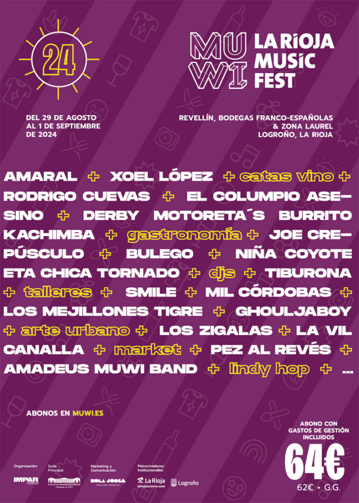El MUWI La Rioja Music Fest 2024 se celebrará del 29 de agosto al 1 de septiembre en Logroño, destacando por la participación de artistas como Xoel López, El Columpio Asesino, Rodrigo Cuevas y Amaral. Este festival, galardonado en los Iberian Festival Awards por su programación cultural, promete ser una de las ediciones más ambiciosas hasta la fecha. Con más de treinta artistas y diversas actividades, el festival tendrá lugar en emblemáticos lugares de Logroño como la Muralla del Revellín, Bodegas Franco-Españolas y la Calle Laurel.